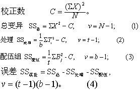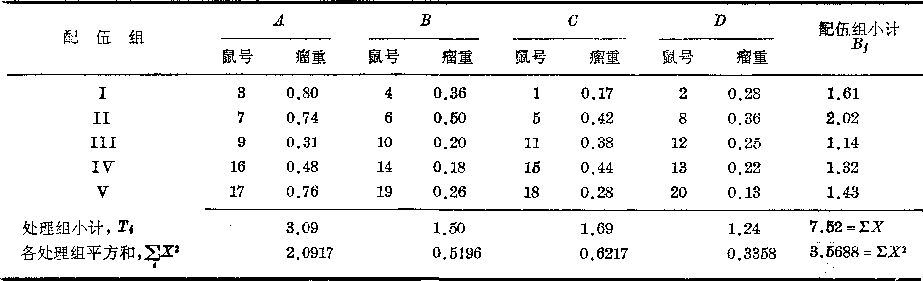 经整理后各处理组的小鼠号及试验结果见表1。 表1 四种药物抑瘤效果(瘤重,g) 分析 用方差分析。 (1)作检验假设,有两种: 一是各处理组间的比较,H0为各处理组的总体均数相等; 二是各配伍组间的比较,H0为各配伍组的总体均数相等。 (2)将总变异的离均差平方和及自由度按变异来源分析为处理组、配伍组及误差三部分,计算公式为: (3) 分别计算处理组及配伍组的均方MS(=SS/v),并与误差的均方相比得F值,如表2。 (4)查F界值表得P值,按所取检验水准作出推断结论。 例2 试对表1资料作方差分析。 药物间: H0: 四种药物的抑瘤作用相同, H1: 四种药物的抑瘤作用不同或不全相同。 配伍组间: H0:五个配伍组间抑瘤作用相同, H1: 五个配伍组间抑瘤作用不同或不尽相同。 均取α=0.05。 N=20,b=5,t=4,∑X=7.52,∑X2=3.5688。 表2 表1数据的方差分析
