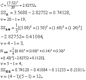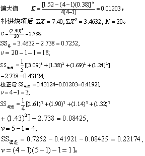 检验假设同例2。 今t=4,b=5,缺项补漏前T=1.00,B=1.52,S=7.02。 表4 补进缺项后的方差分析
