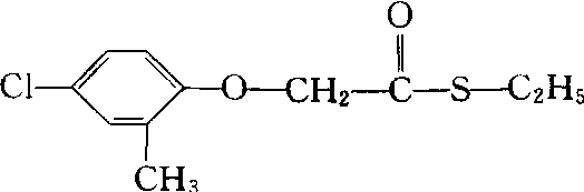 酚硫杀phenothiol又称芳米大。苯氧基类激素型内吸、选择性茎叶处理除草剂。化学名称:S-乙基-(2-甲基-4-氯苯氧基)硫赶乙酸酯。化学结构式如下。原药为黄色至浅棕色固体,密度1.20,熔点41~42℃,沸点165℃(933 Pa)。20℃时蒸气压为213.3×10-4 Pa,微溶于水,易溶于丙酮、甲醇、乙醇、氯仿、二甲苯、苯、己烷等有机溶剂。在弱酸中稳定,在碱性介质中易分解,遇热易分解。能被茎叶和根吸收,进入植物体内后水解成2甲4氯,干扰内源激素的平衡,使细胞分裂加快,呼吸作用加速,导致生理机能失去平衡。适于水稻、小麦等禾谷类作物使用,防除播娘蒿、刺儿菜、牛繁缕、荠菜、泽漆、藜、节节菜、泽泻、鸭舌草、矮慈姑等阔叶杂草。对大鼠急性口服LD50为790(♂)~877(♀) mg/kg,急性经皮LD50>5 000 mg/kg,急性吸入LC50>5 mg/L。对鱼类有中等毒,对鸟类低毒。