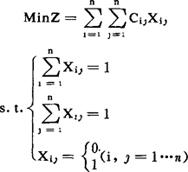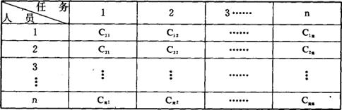 有n项工作,分配给n个人去完成,一个人只分配一项工作,一项工作只由一人去做。 已知每个人完成每项工作的效率,要求进行人员的合理分配,使总的效率最大。这类问题称分配问题,或称指派问题。 设Cij表示第i个人从事第j项工作的效率;Xij表示分配第i个人从事第j项工作的变量,这里Xij是一特殊变量,称0-1变量。Xij只能取0或1两个数值,Xij=1表示第i个人分配干第j项工作,Xij=0表示第i个人不担任第j项工作。 那末,分配问题的数学模型为:  上述模型通常用一个矩阵表格表示,这个表格以列表示待分配工作人员,行表示待完成工作项目,行列交叉处数值填入效率值C1j,故称效率矩阵。  一般地,当表中元素Cij表示时间、费用(或成本)、距离时,这类分派问题欲得到以极小值为目的的最优方案,称极小化分配问题;当Cij表示产量、售价、利润、产值、得分等时,是以得到极大值最优分配方案为目的,称极大化分配问题。 当上述表格为方阵,即行数与列数相等时,称人员与任务(或称资源与用途)相等的分配问题;否则,称人员与任务数目不等的分配问题。 |