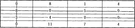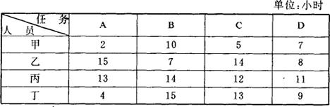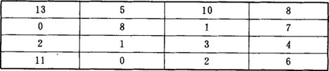 释义 | 分配问题匈牙利解法 一种依据分配问题特点而建立的求解分配模型的简便算法。 此法由匈牙利数学家克尼格提出,常称“匈牙利法”。其步骤如下: (1)对待求解问题,正确地列出效率矩阵{Cij}n×n。 (2)简化原始矩阵表,使表中每行、每列至少出现一个0元素。 方法是:将原始表格各行元素数值同时减去本行最小元素数值,或将各列元素同时减去本列最小元素。 这样组成了一新的效率矩阵表{C′ij}n×n。 (3)在新的矩阵表中,用最少的纵线条和横线条将所有的零值划去。 当所用的线条数目不少于(一般取等于)方阵的维数(n)时,即可得到最优分配方案。 进行划线盖0时,所用直线不能同一方向;将表中0全部划去的形式有多种,但只要是所用线条数目最少的,就可选取。 符合这个要求时,可用以0定方案的方法得到最优分配方案: ❶ 找出只有一个0元素的行(或列),用圈圈起来,于是该0元素所在列(或行)上其他0元素失效,可打×记号。 ❷ 再检查其它行(或列),对只有一个0元素(打×失效的0元素不予考虑)的,也照上法圈起来,失效元素亦打×。 ❸ 重复上述过程,直至打圈0元素个数为n,且分别在不同行不同列。打圈0元素所在位置变量Xij=1,表示该元素行对应的人员应去完成该元素列对应的任务。 其余位置变量Xij=00 当盖0线条最少数目不满足要求时,必须转于下一步骤。 (4)调整变换。 对矩阵表内不同元素分别进行如下变换: ❶ 矩阵表未被盖0线条划去的元素,分别减去这些元素中的最小数,得到相应的新元素。 ❷ 矩阵中处于纵横盖0线交叉点的元素,加上❶ 中减去的这个最小数。 ❸ 矩阵表中其他被划去的元素,按原值不予变化。 由此变换得到一个调整后的新矩阵表{C″1j}n×n,再转入第(3)步骤。 例:用匈牙利法解下表所示的分配问题。 解:上表每行分别减去该行的最小数得到: 上表中第三列每个元素减去1,得到一个每行每列都有零值的新表,并划线覆盖0元素得: 上表中最少覆盖线有三条,小于方阵阶数4,进行调整变换。 上表中未被划去的数2、5、6、1、8、5,分别减去其中最小数1;表中交叉元素2、3分别加1;其余元素不变。 这样,得到一调整后的新表,并划线覆盖0值得: 上表中最少覆盖线仍有三条,仿上面法则进行调整运算得: 上表中最少划0覆盖线有4条,问题已达到最优解,根据“按0定方案”法则进行分配,得到4个圈零数,并在不同行和不同列,仍见上表。得到的最优分配方案为:甲-C,乙-B,丙-D,丁-A。这样分配的最短时间值为:Z=5+7+11+4=27(小时)。 上述算法只适用于工作人数与任务数目相等的极小化分配问题。 对极大化分配问题,首先找到原始矩阵表中的最大元素。然后以这个最大的数作被减数,分别减去表中所有元素,得到一个“缩减矩阵”,将“缩减矩阵”按上面方法求解即可。 上面的例子如果是求极大化分配问题,首先用表中最大数15,分别减表中各元素,得到下面的“缩减矩阵”(见下表),即化为了极小化的分配问题。 对于工作人员与任务数目不等的分配问题,只要虚拟一些工作人员(任务多于人数时)或虚拟一些任务(人员多于任务时),虚拟行或列在矩阵中元素值取零值。这样就转变成了人员与任务数目相等的分配问题了。 |