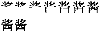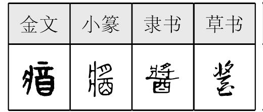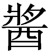 酱醬jiàng(13画) *酱(醬)jiàng13画 酉部 酱醬jiàng《说文》所载西周晚期籀文从酉、从皿,爿(床本字)声。战国以后省“皿”,只从酉,爿声。小篆及西汉隶书都从肉从酉,爿声,没有寸旁。甲骨文金文将它作偏旁也省寸旁。以后才作“醬”,从酉,将(將)声,到楷书。现今规范字仍从小篆来,群众从行书楷化,作酱。见《总表》。本用肉制作,中古以后用发酵后的豆、麦等做成的调味品。近代现代例如:黄酱|甜面酱|豆瓣酱。转为动词,指用酱或酱油腌制(菜)。如:萝卜酱一酱。又指像酱的糊状食品。如:芝麻酱|苹果酱。 酱醬★繁◎常★常jiànɡ醬,形声,从酉,將声,本义为肉酱,肉制的糊状调味品,引申为用豆、麦子等做成的糊状调味品、用酱或酱油腌制、用酱或酱油腌制的糊状食品等。汉代俗字作“ ![]() |