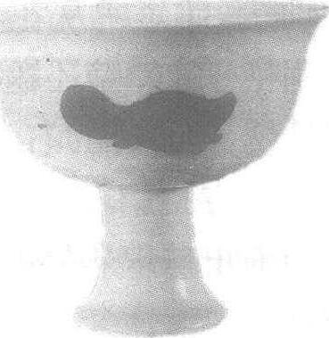 明宣德年间制品,现为日本大和文华馆所藏。杯高8.8厘米,侈口、浅腹、高足,底呈喇叭形,造型为元、明时常见的高足杯样式。胎体较厚,釉白莹润。腹壁外绘三条鳜鱼仅画出鳜鱼的大体轮廓,如剪影式,笔简形具,红白相映,韵味无穷。釉里红色调纯正,鲜艳如宝石红。杯内有青花双圈 “大明宣德年制”楷体款。此杯体现了宣德时釉里红烧造已达到了较高水平,与元末明初釉里红的灰暗色调形成对照。