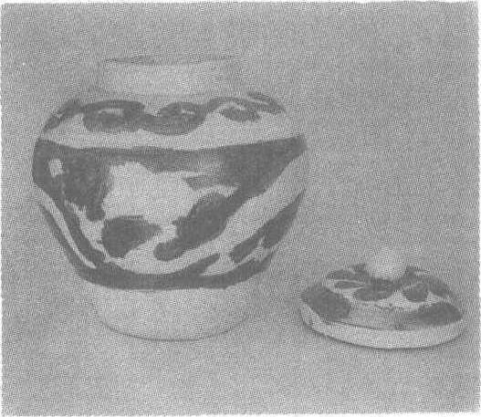 元。高28厘米,口径12.8厘米。江苏省吴县文物管理委员会藏。釉里红瓷器是元代新创烧的一个品种。它是以铜红料在瓷胎上饰纹后罩一层透明釉,在高温还原气氛中一次烧成。因釉里红对窑室中气氛要求严格,所以烧成难度较大。这件直口、丰肩的盖罐釉里红发色比较纯正鲜明,可谓成功之作。其装饰手法也较有特色,盖和肩以釉里红作点缀图案,腹部的主题纹饰则是刻划一条行龙,龙以外的空隙处以铜红料涂抹,烧成后为红地白龙的效果。在一件器物上使用了白地釉里红纹和釉里红地白纹两种相反的装饰手法,这在釉里红瓷器上是不多见的。