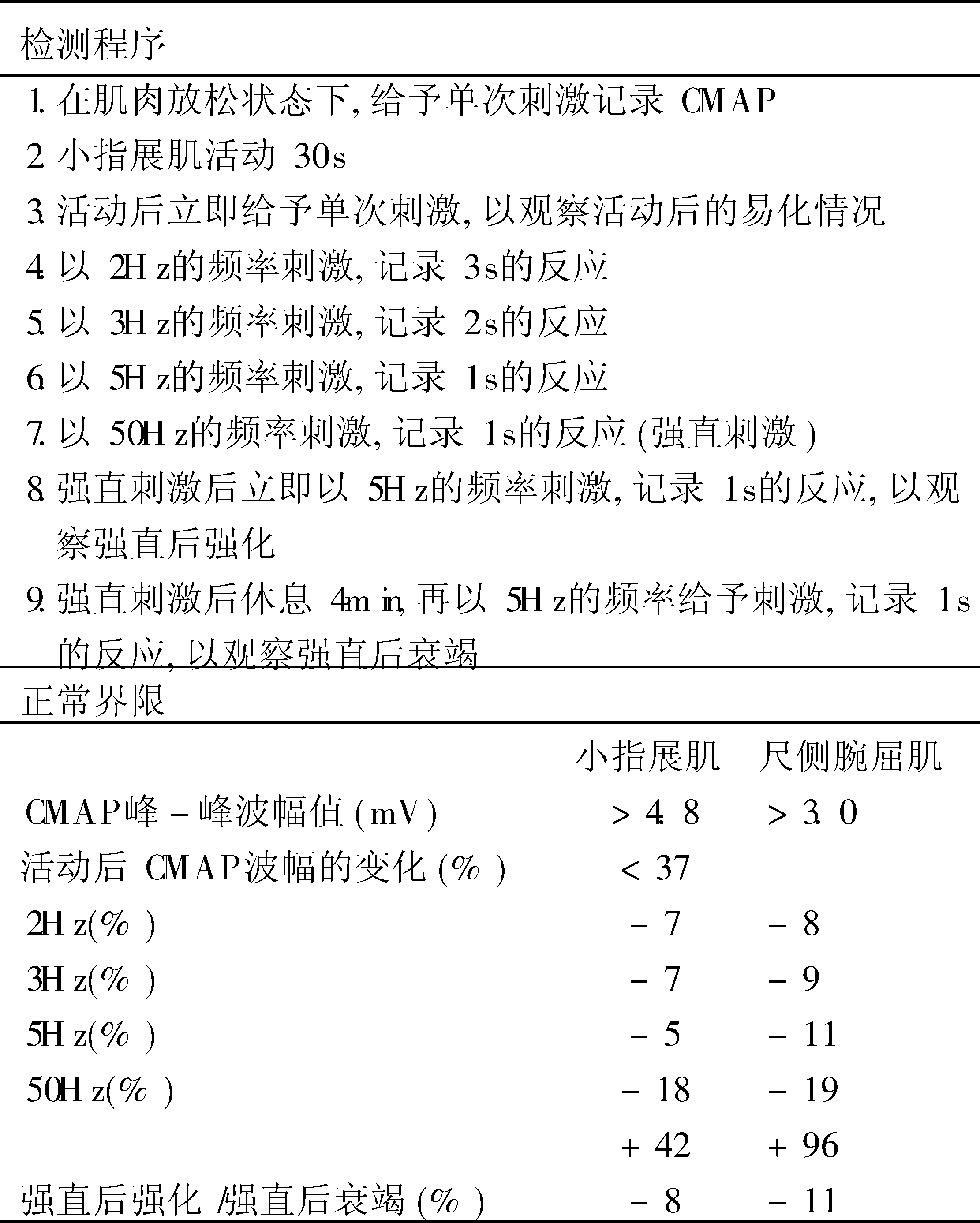 释义 | 重复神经刺激 重复神经刺激repetitive nerve stimulation,RNS以一定的速率(3~50Hz)重复刺激任何一条运动神经,并在其支配的肌肉记录运动反应,分析反应波形的变化,称重复神经刺激。其中1~5Hz刺激为低频刺激,10~50Hz为高频刺激。常用于研究神经肌肉传递障碍性疾病,在重症肌无力患者,当给予低频超强刺激时,系列冲动可使CMAP波幅进行性减低。Oh SJ将RNS检测程序及正常参考值归结为表1,神经肌肉传递病变典型的RNS所见如表2。 表1 RNS检测程序及正常参考值 表2 神经肌肉传递病变典型的RNS所见 ☚ H反射 诱发电位 ☛ |