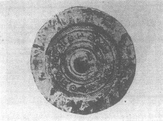 西周。直径8厘米。1972年陕西省扶风王太川村北土壕的窑穴出土。圆形,体轻小,镜面略向内凹呈孤状,背面中央铸弓形钮,外饰重环纹。无镜铭。