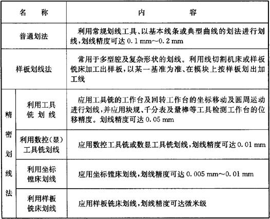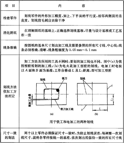 划线是零件在成型加工前的一道重要工序。零件经外形加工后,以某些基面为基准,在待加工部位划出所有需加工部位的尺寸线及中心线,作为下道工序加工时定位、找正、加工和测量的依据。但尺寸精度仍需通过加工时的测量给予保证。 (一)划线注意事项(表5.2-1) 表5.2-1 划线注意事项   (二)划线方法(表5.2-2) 表5.2-2 划线方法  精密划线的加工线,可直接作为加工及测量的基准。操作中计算刻度时应消除丝杠的空回;校正打表时应与所划线条同方向的基准边平行;划针对好工件,接触深浅要适当,以划出清晰的线条为原则。 (三)打样冲眼 沿划出的加工线及中心位置的交点打样冲眼。样冲眼的深度应保证精加工后不会残留痕迹,中心位置交点处的样冲眼必须准确地打在交点的中心。要求精度较高时应在机床上用中心钻定中心,或利用坐标镗床定孔的中心。圆弧中心点的样冲眼要求打得准、轻,划规能站住脚。 |