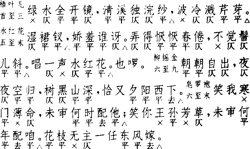 释义 | 金井水红花 金井水红花梁辰鱼 《浣纱记》 ![]() 全曲十七句:5,5△,5△。3△,4△。6,5△。5△。也啰4,4,4,4△。4,4△;4,4△。7△。首二句本三字,但作者均作五字句。第八句本五字,但多作六字折腰句。“也啰”是〔水红花〕曲末定格。〔柳摇金〕四字四句,可作对语,首末两句可加用二衬字,中间二句未见用衬字者。〔皂罗袍〕四字四句,应作两排,加用衬字者少。末句本七字,但作者喜破为四字、五字两句。〔金井水红花〕例叠用二支,偶有单用 一支。《白兔记·游春》叠用四支,仅见。一名〔梧蓼金罗〕,但传奇仍题〔金井水红花〕。 ☚ 梧叶儿 梧桐树 ☛ |