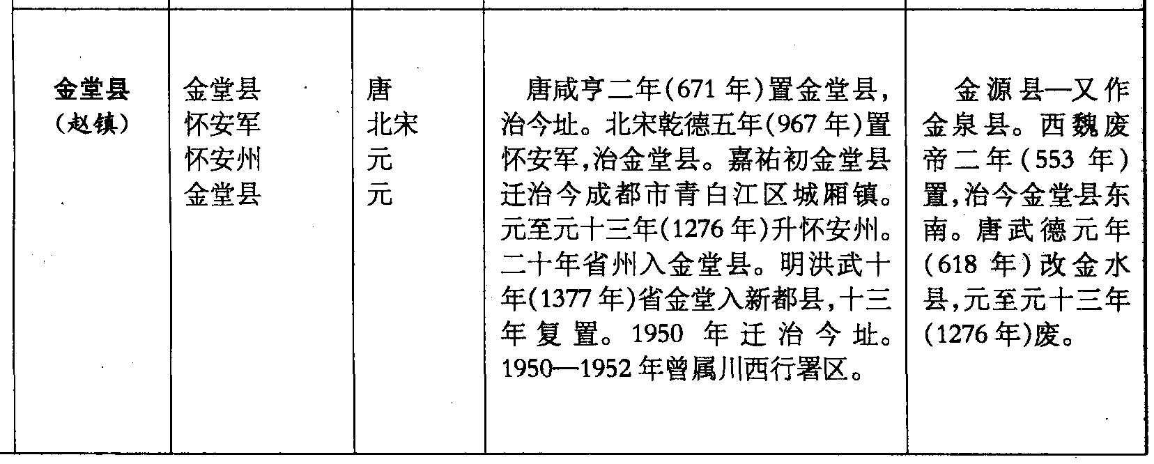 金堂县(赵镇)金堂县怀安军怀安州金堂县唐北宋元元唐咸亨二年(671年)置金堂县,治今址。北宋乾德五年(967年)置怀安军,治金堂县。嘉祐初金堂县迁治今成都市青白江区城厢镇。元至元十三年(1276年)升怀安州。二十年省州入金堂县。明洪武十年(1377年)省金堂入新都县,十三年复置。1950年迁治今址。1950—1952年曾属川西行署区。金源县—又作金泉县。西魏废帝二年(553年)置,治今金堂县东南。唐武德元年(618年)改金水县,元至元十三年(1276年)废。