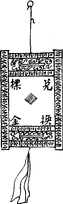此幌为木制,其框为黄色、并绘有黑卷花图案、幌心为白色,中间贴一黄色金叶模型,四周用黑字书写“兑换标金”字样。