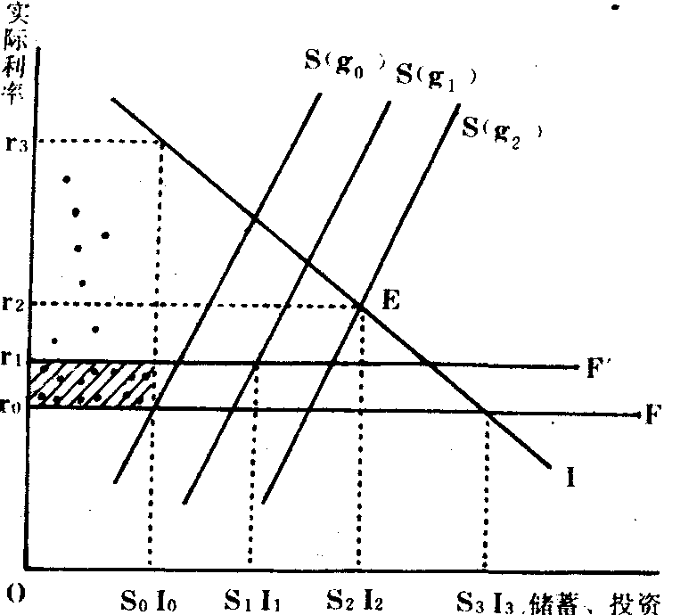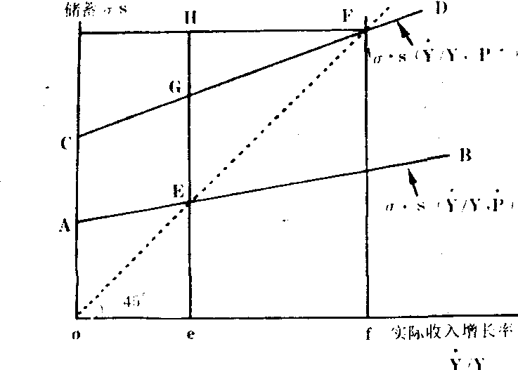 图12—24 如图12—24所示。S(g0)、S(g1)和S(g2)分别表示经济增长率为g0、g1和g2时的储蓄水平,I表示投资,F和F1表示金融压制,指政府人为地压低实际利率,在图中表现为r0和r1。如果存款利率为r0,则储蓄为S0,投资供给为I0,但人们的投资需求却为I3,I3-I0便是投资资金供求的缺口,如果不限制贷款利率,则贷款利率会升至r3,但事实上,政府通常也将贷款利率限制在r0。结果,投资资金的供不应求造成了配给制,并导致低效益的投资(图12—24中的阴影部分)。如果把利率提高到r1,一方面,储蓄和投资分别上升到S1和I1;另一方面,贷款利率的上升会阻止低效益的投资,增加高效益投资。这样,投资平均效率的提高促使经济增长率上升到g1。如果进一步提高利率,取消金融压制,或有效地降低了通货膨胀率,储蓄和投资将进一步增加,经济增长率会继续上升。如图所示,当利率提高到r2时,储蓄为OS2,投资为OI2,经济处于均衡状态。 但是,他们同时又强调,提高利率能促进经济增长并不等于利率越高越好。在麦金农看来,如果利率过高,使d- *超过一定限度(接近内源融资投资可以获得的最佳边际收益和内部收益),则往往导致新的资产替代从实质资本积累转向现金余额,即货币与实质资本成为相互竞争的替代品,从而发生竞争资产效应。![]() 图12—25 如图12—25所示,随着利率从A上升到B,货币需求增加,投资的数量和效率也相应提高。也就是说,在AB区域里,由于货币的渠道效应,实际货币需求M/P和投资/收入比率I/Y将产生互补,从而促进经济增长。但是,当货币收益率大于B时,竞争资产效应(即替代效应)反而会引起实质资本积累的降低从而减少投资。所以,要使内源融资投资效率最大,只须将利率提高到B点。 麦金农对哈罗德——多玛模型的修正 麦金农还通过批判哈罗德——多玛经济增长模型来说明储蓄倾向将受实际利率的影响而发生变化,从而论证了金融深化与经济增长的相互作用。设Y为实际收入或产量, =dy/dt,S为储蓄倾向,δ为一常数,代表资本生产率或投资效率(δ=y/k,k为实际资本存量)。则哈罗德——多玛模型是: /y=δs。然而,麦金农认为,S并不是一个常数,而是受收入增长率和其他金融变量(如实际利率)影响的变量。即S=S( /y; P)0 p表示金融体制改革后各种金融深化的指标。由此,他把哈罗德——多玛模型修正为: /y=δs( /y;P)该等式包含了经济增长率、储蓄倾向和金融深化的相互作用。如图12—26所示。 虚线是从原点引出的45°角直线,该线上的任何一点,都代表均衡增长率,即 /y= δs。现假定金融体制尚未彻底改革,p= ,这时的储蓄函数AB很低,AB与45°线相交点E所决定的均衡收入增长率只有Oe。若进行了金融改革,金融深化有显著成效,即P=P*,则储蓄倾向将大大提高,从而使投资率和收入增长率也相应提高。在图中,储蓄曲线上升到CD,并与45°线相交于F,由此决定的均衡收入增长率提高到of。在麦金农看来,金融改革或金融深化对储蓄的效应有两个:一个是总储蓄函数上移。即在收入增长率还未上升之前,金融改革对储蓄的刺激作用(由E升至G)。另一个是总储蓄函数相对于y的斜率增加。即收入增长率上升后对储蓄的进一步推动(由G升至H),在图中表现为CD向AB倾斜。