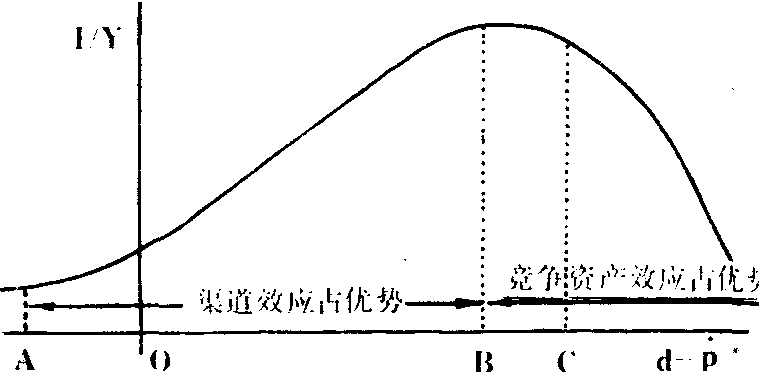 当然,提高利率能促进经济发展并不等于利率越高越好。如果利率过高,使d-P*超过一定限度 (接近内源融资投资可以获得的最佳边际收益和内部收益),则往往导致新的资产替代从实质资本积累转向现金余额,即货币与实质资本成为相互竞争的替代品,从而发生竞争资产效应。如图所示,随着利率从A上升到B,货币需求增加,投资的数量和效率也相应提高。也就是说,在AB区域里,由于货币的渠道效应,实际货币需求M/P和投资/收入比率I/Y将产生互补,从而促进经济增长,但是当货币收益率大于B时,竞争资产效应 (即替代效应) 反而会引起实质资本积累的减少,从而减少投资。所以,要使内源融资投资效率最大,只须将利率提高到B点。 麦金农认为,推进金融深化的关键在于提高实际利率。然而,这种推行高实际利率的偏好策略 (在这些利率水平下,实际融资是很充裕的),在一个存在严重的和不稳定的通货膨胀的经济中,几乎是不可能实行的。因此,他特别强调政府当局应有效地控制通货膨胀。但是,他又不主张通过控制名义货币量去抑制通货膨胀,认为这样只会造成生产下降、失业增加和经济衰退。他认为,政府当局可以用一种完全不同的方式来紧缩经济,即 “政府当局不再按非均衡利率直接减少货币和信贷供应,而代之以提高货币持有者的预期收益,来增加货币需求。”也就是说,当提高名义存款利率 (货币持有者的预期收益) 时,相应地,在人们急于得到现金余额时,商品需求就会减少。从个别经济单位看,企业和居民都会努力增加货币持有量,从总体经济看,经济中的M/P (实际货币需求)将会增加。不仅如此,国内存款高利率还将吸引外资的流入,从而增加国内储蓄总水平。结果,由于货币持有量的增加,从而对商品总需求的减少,以及实际货币需求增加,从而对总产出量的增长会使物价上涨率自然下降。 他认为,当通货膨胀得到控制时,政府还应全部取消国内的价格管制和税收补贴工具配给制,特别是实行税收体制深化。他认为,发展中国家严重地依赖各种各样而非统一的间接税,这种以间接税为主的税收体制使税收的收入以更低的比例增加,从而增加了财政赤字压力。因此,他认为应该改革税制,给税收体制注入更多的弹性。具体说来,就是采用统一的增殖税,即对企业的工资、薪金、利润、利息和租金之总额实行统一税率。这种增殖税有许多优点,如避免了有差别的商品税收或多重税收,对收入的增长富有弹性等。此外,他认为政府当局还应放松对汇率的管制,让汇率正确地反映外汇市场的供求情况。因此,他主张放松外汇管制。在适当的范围中让汇率自由浮动,这不仅能够鼓励出口和吸收外资流入,而且可以限制不必要的进口。 ❷肖的观点。在1973年出版的 《经济发展中的金融深化》一书中,肖对发展中国家的金融深化问题也进行了系统地研究。他指出,金融深化意味着实现金融与经济发展的相互促进关系。为了说明这种促进效应的大小,或者说衡量金融深化之程度,肖提出了金融深化的尺度和作用。在肖看来,衡量金融深化的尺度主要有: 其一,存量指标。如金融资产的种类和存量,金融资产存量与收入之比,金融资产存量与有形财富 (真实财富) 存量之比,这些绝对指标或相对指标的上升便意味着金融深化的程度越高。其二,流量指标。肖认为,金融流量易于表现金融深化,例如,对国外储蓄要求的降低,资本外流的减少,货币流通速度的减慢,金融职能和金融机构之专业化,场外非法金融交易的减少,有组织的金融市场的发展等。其三,金融资产的价格。这是金融深化与否的最明显的表现,即利率的升降,从而各种金融资产的价格能正确地反映金融市场上的资金供求关系。或者说,名义利率与实际利率以及各种利率结构的合理化。其四,汇率指标。官方汇率与黑市汇率的缩小程度即意味着金融深化程度的提高。 提出了上述金融深化的衡量尺度后,肖还指出了金融深化对经济发展的积极作用: 一为有助于提高私人储蓄对收入的比率。金融深化将促进储蓄和金融机构的实际增长,从而为投资者提供了更多的资金,增加积累,促进国民收入的增长。二为金融深化将使政府储蓄增长。金融深化意味着通货膨胀被控制,税收体制更完善,这将使政府财政收入得到更快增长。三为金融深化还会阻止国内资金外逃,同时吸引国外资金流入。四为通过金融市场的扩大和多样化,金融深化开辟了优化储蓄分配的道路。五为金融深化将提高投资的效益,使储蓄资金发挥更大的作用。六为金融深化及其相关的政策有助于促进收入分配的平等。如利率的提高可能既增加就业又提高工资收入的份额,同时还会减少垄断收入。 为了说明金融如何促进经济发展,从而实现金融深化,肖也提出了一个发展中国家的实际货币需求函数: