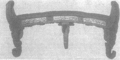 清康熙。面高37.5厘米,宽88厘米,深9厘米,通高47厘米。北京故宫博物院藏。凭几是古代席地而坐时置于膝前的家具,盛行于魏晋南北朝时期。此几呈弓形。三足,几头上翘如牛角,腿足外卷似象鼻。几面前后金髹浮雕龙纹、祥云纹,并嵌象牙雕苍龙教子图。腿足,几头上凸刻海浪,卷云等纹饰。造型别致,髹饰华丽,为传世的清宫家具中的孤品。金髹见“黑漆金髹龙纹交椅”条目。