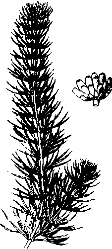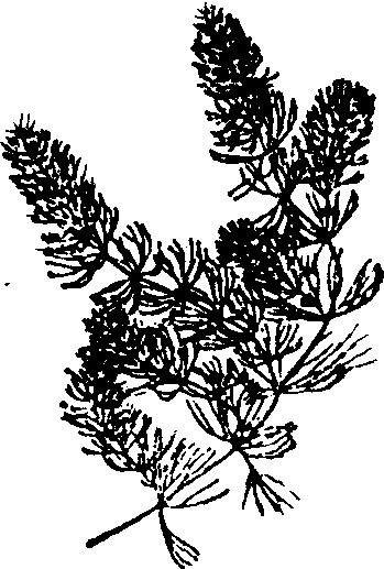 金鱼藻hornwortCeratophyllumdemersum Linn.,又称灯笼丝。金鱼藻科,金鱼藻属。多年生沉水草本。生于池塘和河溪中。中国分布广泛。茎平滑,分枝。叶8~10枚轮生,2~4回叉状分裂,裂片丝状,先端为白色软骨质,边缘仅一侧有细齿。雌雄同株,稀异株;花被片6~12枚;雄花有雄蕊10~16枚;雌花子房1室。坚果扁椭圆形,顶端有宿存花柱,基部两侧有刺。全草可为鱼、鹅、猪的饲料,也供药用,治内伤吐血。