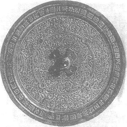 西汉。直径18.6厘米,边厚0.6厘米。1951年湖南省长沙出土。北京中国历史博物馆藏。镜圆形,呈绿褐色。背面有鎏金,中央有半球状镜钮,方形钮座饰柿蒂纹,四蒂中各有一兽头。钮座外饰有T、L、V形的规矩纹和羽人灵兽纹。镜的边沿依顺时针排列有一周篆书铭文:“圣人之作镜兮,取气于五行;生于道康兮,咸有文章;光象日月;其质清刚;以祝玉容兮,辟去不祥;中国大宁兮,子孙益昌;黄裳元吉有纪纲。”共计57字,铸有“中国大宁”铭文的铜镜,在广西梧州也有出土,它反映出西汉时期,中原、边陲的安定和繁荣。镜的制作精致,保存完好,在出土众多的西汉铜镜中,堪称个中翘楚。