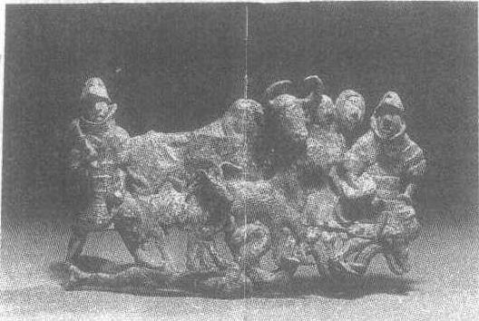 西汉。高9厘米,宽15厘米。云南省晋宁石寨山出土。云南省博物馆藏。通体鎏金。最前一人为武士,身着盔甲,左手提一辫发之民首级,右手牵一绳,绳索拴住一妇女,妇女身背一小孩。其后为一牛一羊。最后一人也为武士,右手持一斧形器扛在肩上,左手提一辫发之民首级。人兽皆踏在两条巨蟒身上。扣饰所表现的内容当是一场战争之后的献俘场面。武士是胜利者,败者一方,仅留下妇女、小孩和牲畜,首级可报功进行“人祭”。在奴隶制时代,战争是掠夺财富和奴隶的主要来源。奴隶既可被强迫劳动创造财富,又可作为杀祭的对象。晋宁石寨山出土的杀人祭祀场面贮贝器则恐怖地表现了当时杀祭奴隶的情况。