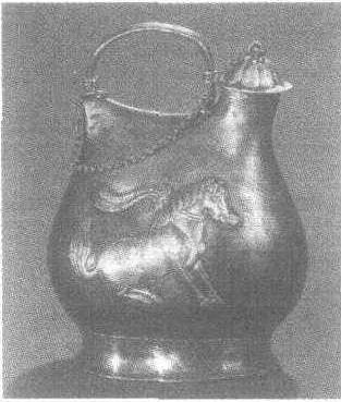 唐代制品,1970年出土于陕西省西安市何家村窖藏中,现为陕西历史博物馆收藏。壶高18.5厘米,口径2.2厘米,足径8.8×7.1厘米。造型如北方少数民族使用的皮囊,下有圈足,足内墨书“十三两半”。壶腹两侧有模冲出的舞马各一匹,马口衔杯,腹、足结合处饰同心结 一周。壶腹的装饰表现的是宫廷祝寿场景,唐玄宗时曾驯养一批骏马,它们能闻乐起舞,八月五日,皇帝生日,大宴百官,舞马于兴庆宫勤政楼下,曲终,舞马跪拜献寿,玄宗赐酒,舞马衔杯自饮,壶腹的装饰就是这个情景。但是,舞马下场凄惨。安史之乱爆发,一些舞马辗转归了叛将田承嗣,而田不知其功用。一次,军中饮宴,马仍闻乐起舞,马夫以为妖奇,抽打它们,舞马以为舞得不好,愈加奋首鼓尾,田承嗣知道后,命属下痛打,以致舞马暴死枥下。