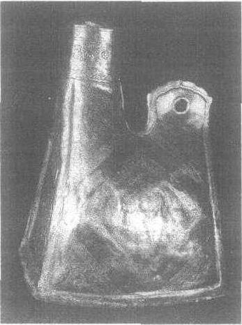 辽代制品,1979年在内蒙古赤峰市洞后村一窖藏中出土,现藏内蒙古自治区赤峰市文物工作站。壶高26厘米,底长21厘米,宽16厘米,底部为一块矩形薄铜片,四面与薄银片镶合,做成壶形。壶颈高耸,壶口小而设盖,盖原有链与壶颈的小环相连,使内贮的液体难以泼撒; 壶身上窄下宽,平底,安稳性强,放置时不易倾仄;上方开 一孔洞,以穿绳系带,又便于远途携行; 设计的实用性非常突出。图案錾刻鎏金,以壶腹的卧鹿为主题,角隅、壶侧和颈部为卷草等,大多以鱼子纹为地,纹样和制作技法与唐代酷似。将富于民族特色的造型与继承前代传统的装饰完美结合,难能而可贵。银器中的鹿纹在中亚、西亚、唐代中国已屡见不鲜,而它在辽代的出现可能还与契丹统治集团的秋猎有关,射鹿是其秋猎的重要内容。