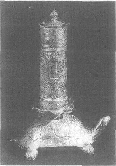 释义 | 鎏金龟负 鎏金龟负“论语玉烛” 银筹筒唐代制品,1982年出土于江苏省丹徒县丁卯桥窖藏中,现为江苏省镇江博物馆收藏。通高34.2厘米,筒深22厘米,龟长24.6厘米。以龟为座,背负一圆柱形筒,筒腹錾刻卷草中的龙凤,龙凤之间有一长方形框,内刻 “论语玉烛”,筒内放置酒令筹50只,内容取自 《论语》。筒盖形若荷叶,钮如荷蕾。构思巧妙,造型新奇,唐代金银器出土传世虽多,但这样的作品仅知一例。 鎏金龟负论语玉烛银筹筒 古人饮酒常行令,这个龟负筹筒内的筹牌即做此用,其上錾《论语》中的一句,下錾应饮人,应饮量,为研究唐代饮酒风俗提供了宝贵的实物资料。 ☚ 镂空三层五足银熏炉 刻花金碗 ☛ |