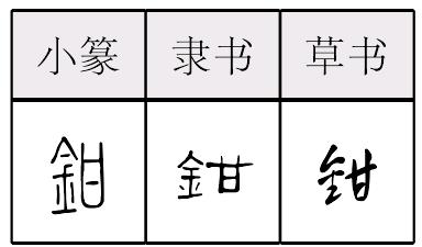 【提示】钅,5画,第二笔是横,不要写成侧点,第五笔是竖提,不是一竖、一提两笔。甘中间的横,宋体与左右两边相接,楷体与左边相接,与右边相离。 *钳(鉗)qián10画 金部 (1) 古代的一种刑具,束颈的铁圈。 (2) 限制;约束: ~口|~制。 (3) 夹东西的工具: ~子|老虎~。 钳qián小篆以来的形声字。从钅(金),甘声。声母演变如甘嵌箝(qián)、工空腔、高敲例。本指古代一种刑具,是捆着脖子的铁圈。引申指夹东西的用具。如:老虎钳。转为动词,指用东西夹住。组词如:钳制(指用强力限制)。古代又有箝字。从竹,从拑(从手,甘声。读qián,也夹住义),拑亦声。本夹住义。又转为名词,同钳。 钳鉗★繁◎常★常