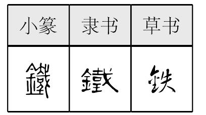 tiě鐵,形声,从金, (zhì)声,本义为一种金属元素,质地坚硬,引申为刀枪等武器、强硬、坚强、强暴、精锐、确凿、坚定不移等。元代俗字、《手头字》、《简体字表》把音符改为失;《简化字表》进一步把意符类推简化,作“铁”。 |