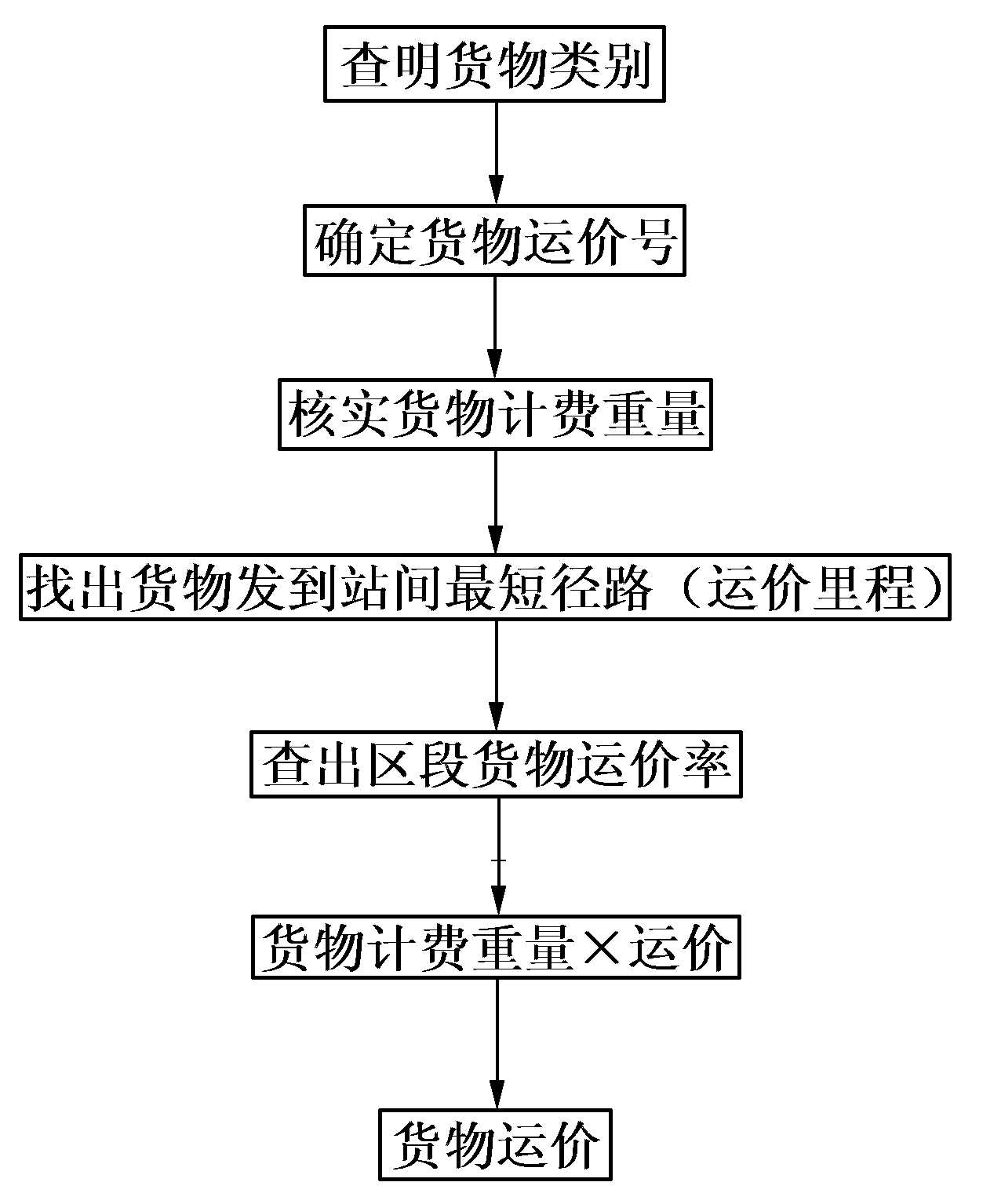 铁路货物运输产品的销售价格。根据货物运输条件,制定各种类别的运价制度。按适用范围分为:普通运价、特定运价、地方运价、国际联运运价。按货物发送批量、使用容器分为:整车运价、零担运价、集装箱运价、冷藏车运价。按运输速度分为:快运运价、普通运价。铁路货物运价根据货物种类、运输距离,按重量核收不同的费用:货物计费重量,整车以吨为单位,零担以10kg为单位,集装箱以箱为单位。货物运价里程根据发站至到站间国铁正式营业线最短径路确定。但《货物运价里程表》内或铁道部规定有计费径路的,按规定的计费径路计算运价里程。计算货物运价的工作流程如下图所示。