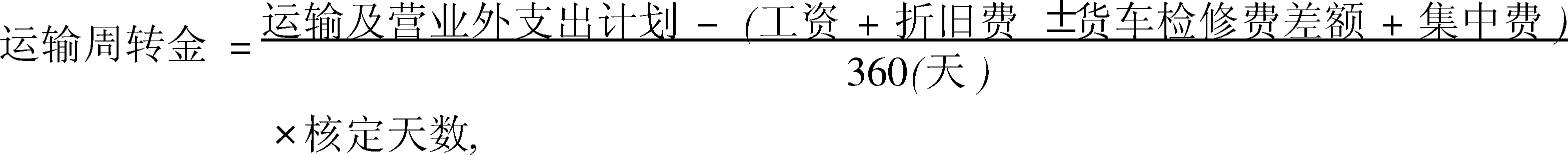 由于铁路运输进款集中到铁道部,铁道部每月分二次拨款清算,设置运输周转金是为了及时补充资金,保证生产不间断进行。铁路运输企业实行“客、货网分账核算”办法后,各铁路局客运担当收入的资金直接来自市场,并将取得的收入资金直接用来保证客运运输生产所需的运营资金;铁道部对各铁路局核定的货网营运资金,用于保证每月正常的货网经费开支。其计算公式为: