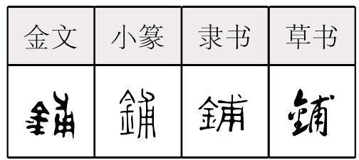 鋪,形声,从金,甫声,本义读pū,铺首,古代建筑的门环的底座,假借为设置、安排,由此引申为铺开、摆开;又读pù,引申为床铺、铺盖、店铺、古代的驿站(为传递官府文书而设的中途歇息的地方)等。俗字作“舖”,意符改为舍。《异体字表》以“舖”为异体字。《简化字表》把“鋪”类推简作“铺”。 【辨析】 铺/布/敷 这三个字都有布陈、敷陈义,读音相近,是同源字。铺〈动〉摆放;铺设。 《金》六: 酒保一面~下菜蔬果品案酒之类,一面荡上酒来。 另见pù。