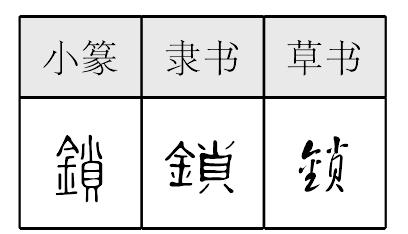 【提示】钅,5画,第二笔是横,不要写成侧点; 第五笔是竖提,不要错分成两笔。 , 不要错写成肖。 *锁(鎖)〔鎻〕suǒ12画 金部 (1) 用铁环连接起来,用以拘系人犯或拴系物品的器具: ~链|枷~|~子甲。 (2) 用锁链拘系人犯: 把犯人~起来。 (3) 一种缝纫方法。用交叉或相勾连的线把布料的边沿缝住,使不开散: ~边儿|~扣眼。 (4) 安在门、窗、抽屉、柜子开合处或活动部位起封闭作用的装置: ~钥(yuè)|铁~|电子~|一把钥匙开一把~。 (5) 在开合处或活动部位加上锁: ~上门|~上车锁。 (6) 形状或功能似锁的: 石~|长命~。 (7) 束缚;封闭: 封~|眉头紧~|闭关~国。 锁鎖鎻suǒ古书作琐。从王(玉),从(琐的本字),亦声。本是玉作的小连环,锁链。中古因有用金属制的。从钅(金)旁,从(琐的本字),亦声。 指加在门、箱等上面使人不能随便开的器具。如:门上上锁。宋代因锁有簧等,又把锁的右上角“小”字改为三折笔,作鎻,现作异体字。见《异体字表》。转为动词,指用锁关住。如:把门锁上。引申指链子。如:枷锁|锁镣。又引申指一种缝纫法,多用在衣物边沿上,针脚很密,线斜交或勾连。如:锁扣眼|锁边。 锁鎖★繁◎常★常