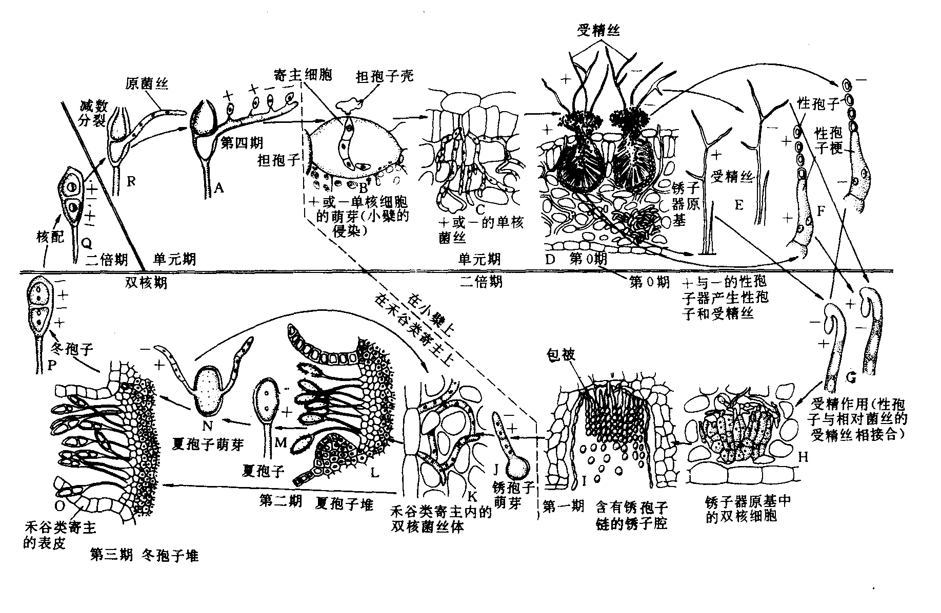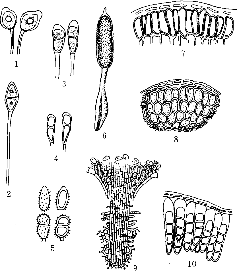 冬孢子和冬孢子堆 是锈菌的有性孢子,从锈孢子、夏孢子或担孢子萌发形成的双核菌丝体上产生。在寄主表皮层或角质层下形成,后外露呈粉状、胶质状或柱状的冬孢子堆,有些种冬孢子堆始终不外露。冬孢子生于冬孢子堆上,单胞、双胞或多细胞,厚壁,有柄或无柄,无色、淡色或深色,表面有刺或瘤,初为双核,经过核配形成单核双倍体细胞。冬孢子形态特征及排列方式,是重要的分类依据。这一阶段的代号为“Ⅲ”。 担孢子和担子 冬孢子萌发产生具有3个隔膜、4个具单个单倍体核的细胞的先菌丝,又称担子。担子的每一细胞生出一个小梗,梗端着生一个担孢子,单细胞,无色或淡黄色。这一阶段的代号为“Ⅳ”。 生物学特性 锈菌均为专性寄生菌,有的种类有转主寄生现象。 寄生性 在自然条件下锈菌是专性寄生的,只能寄生活的植物上,不能营腐生生活。1951年霍特森(Hugh Howison Hotson)和卡特(Victor MacombesCutter)首次报道桧柏锈菌经人工培养成功。1966年威拉姆斯(P.G.Willams)等在澳大利亚报道禾柄锈菌小麦专化型的夏孢子可以在培养基上进行营养生长,1967年他们成功的在人工培养基上进一步获得冬孢子。之后,陆续报道亚麻栅锈菌及石竹单胞锈菌在人工培养基上可以生长; 尽管有上述例子,但只限于极少数锈菌可以人工培养,因此,仍认为锈菌是专性寄生的。 锈菌对寄主植物具高度的寄生专化性。以禾柄锈菌为例,为害小麦的禾柄锈菌不能侵染燕麦,为害黑麦的禾柄锈菌不能侵染燕麦等寄主,因此将禾柄锈菌按其为害的寄主植物划分为7个专化型。同一专化型的禾柄锈菌对同一种植物不同品种间又具高度的专化性,禾柄锈菌小麦专化型,对不同品种的小麦有不同的反应,将其划分为300多个生理小种。如此繁杂的寄生专化型,使植物的抗病育种增加了艰巨性。 转主寄生和单主寄生 是锈菌特有的性状。许多锈菌需要在彼此没有亲缘关系的两种寄主植物上寄生才能完成生活史称为转主寄生; 只需同一寄主植物即可完成生活史的称单主寄生。转主寄生的锈菌,以冬孢子阶段的寄主作为主要寄主,另一个寄主为转主寄主。例如禾柄锈菌,禾谷类作物是它的主要寄主,小檗是它的转主寄主。有些转主寄生的锈菌以经济上重要的寄主为主要寄主,如梨胶锈菌,以锈孢子及性孢子阶段寄生的梨树为主要寄主,冬孢子阶段寄生的桧柏为转主寄主。许多单胞锈菌都是单主寄生的。 生活史 不同的锈菌完成生活史经历的孢子阶段不同,最简单的锈菌生活史只有冬孢子阶段,最复杂的锈菌生活史产生五种类型的孢子,划分成不同的生活史类型。 长(循环型)生活史型(macrocyclic) 产生五种孢子阶段(O,Ⅰ,Ⅱ,Ⅲ,Ⅳ,)的类型的称长生活史型或长循环型(macrocyclic),其中属转主寄生的称转主寄生长生活史型(heteromacrocyclic)(图1),单主寄生的称单主寄生长生活史型(automacrocyclic)。 缺夏孢型(demicyclic)生活史 生活史缺少夏孢子阶段(Ⅱ)类型,其中属转主寄生的称转主寄生缺夏孢型生活史(heterodemicyclic),属单主寄生的称单主寄生缺夏孢型生活史(autodemicyclic)。 短(循环型)生活史型(microcyclic) 缺少锈孢子(Ⅰ)和夏孢子(Ⅱ)阶段,只有性孢子(O)、冬孢子(Ⅱ)和担孢子(Ⅳ)阶段,这类锈菌全部为单主寄生菌。 上述各生活史类型均可以缺性孢子阶段,但担孢子阶段在各类型生活史中均不可缺。 分类 根据冬孢子形态特征进行分类。例如冬孢子是否有柄、冬孢子萌发方式、排列方式是离生或集生(侧面联合)、埋生或外露等,不同学者将锈菌目分为不同的科,近年来有主张直接将锈菌目划分为126个属。其中重要属如图2所示。 图2 锈菌目常见属冬孢子形态 1.单胞锈菌属(Uromyces); 2.胶锈菌属(Gymnosporangium); 3.柄锈菌属(Puccinia); 4.不休白双胞锈菌属(Leucotelium); 5. 疣双胞锈菌属(Tranzsche-lia); 6.多胞锈菌属(Phragmidium); 7. 栅锈菌属(Melampsora); 8.层锈菌属(Phakopsora); 9.柱锈菌属(Cronartium); 10.鞘锈菌属(Coleosporium) 单胞锈菌属(Uromyces Link) 单主寄生或转主寄生菌。性孢子器球形,有长颈,埋于寄主体内,孔口突出寄主体外; 锈子器杯形,顶部裂开,有包被,锈孢子球形至椭圆形,淡色或褐色,串生或单生柄上; 夏孢子堆初生表皮下,后外露,褐色,夏孢子单细胞,球形至椭圆形或其它形状,表面有刺或瘤状突起,黄色至黄褐色,芽孔明显; 冬孢子堆初生表皮下,后外露,深褐色至黑色,冬孢子有柄,单细胞,顶壁较厚,表面光滑或有瘤状突起,深褐色。是锈菌中较大的类群,寄主分布广,有单子叶和双子叶植物,以豆科、禾本科、百合科及菊科植物为主,如蚕豆单胞锈菌[U.fabae (Pers.) deBary]、豌豆单胞锈菌[U.pisi(Pers.) Schrot.]和疣顶单胞锈菌[U.appediculatus (Pers.) Ung.]。 胶锈菌属(Gymnosporangium Hedw.) 转主寄生菌。性孢子器深埋寄主组织中,成熟时突出寄主组织,初为黄色、后为黑色小点; 锈子器毛状,有包被,初埋生,后外露,锈孢子球形或近球形,表面有瘤,黄褐色,串生; 大多数种缺少夏孢子阶段,夏孢子堆初埋生后外露,夏孢子单生柄上; 冬孢子堆垫状或喇叭状及其它形状,遇水胶化,冬孢子双细胞或多细胞有长柄,柄吸水后膨胀,形成胶质块。在寄主上多年生,引起寄主组织膨胀或畸形。常见的有梨胶锈菌(G.haraeanum Syd.)、山 田 胶 锈 菌 (G. yamadaiMiyabe),锈孢子阶段在梨、苹果上,冬孢子在桧柏上。 柄锈菌属(Puccinia Pers.) 单主寄生或转主寄生菌。性孢子器球形,埋生; 锈子器生表皮下,后外露,杯形或筒