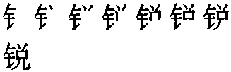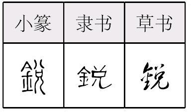 【提示】钅,5画,第二笔是横,不要写成侧点; 第五笔是竖提,不要错分成一竖、一提两笔。 *锐(鋭)ruì12画 金部 (1) 锋利(与“钝”相对): ~利|锋~|精~。 (2) 勇往直前的气势: ~意进取|养精蓄~。 (3) 尖,末端细小: ~角。 (4) 灵敏:敏~。 (5) 迅速;急剧: ~减|~进。 锐鋭ruì《说文》所载籀文作㓹。从剡,锐利义。厂读hǎn,屋下或岩下义。小篆作锐。从钅(金),兑声。声母演变如冉聃(dān)、端瑞例。快或尖(指刀枪的锋刃)义。如:其锋甚锐。组词如:锐利|尖锐。引申为感觉灵敏。组词如:敏锐。又指锐气,即勇往直前的气势。如:养精蓄锐。引申为骤,急剧。如:锐减|锐增。 锐鋭★繁◎常★常