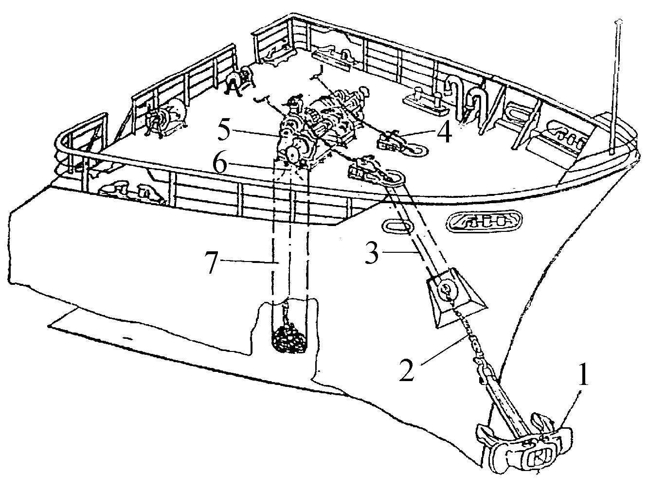 锚设备1-锚;2-锚链;3-锚链筒;4-制链器;5-锚机;6-锚链管;7-锚链舱