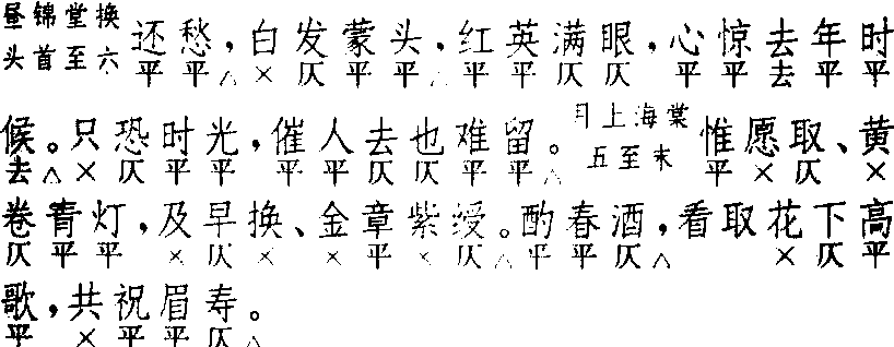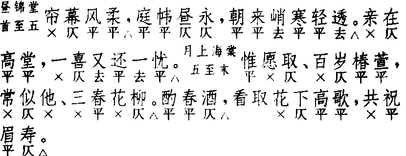 锦堂月 锦堂月高明 《琵琶记》  前腔 换头  正格十句:4 △,4,6 △。4,6 △。7,7 △。3 △,4,4 △。换头格十一句:2 △,4 △,4,6 △。4,6 △。7,7 △。3 △,4,4 △。换头格较正格多首句二字句。各句平仄较原曲有出入,可以互证,参考名篇,以求调协。少用衬字,多作偶句,是本曲特点。〔锦堂月〕为本套首牌,叠用四支或二支,后联〔醉翁子〕、〔侥侥令〕成套,用于婚娶、祝寿、庆赏等喜庆场面,大都多人轮唱,其乐融融,故词以整饬朗润为尚。《怀香记·毕姻封锡》只叠用四支,不接用〔醉翁子〕、〔侥侥令〕,极少见。小令兼用,只用正格。 ☚ 昼锦堂 醉翁子 ☛ 00007676 |