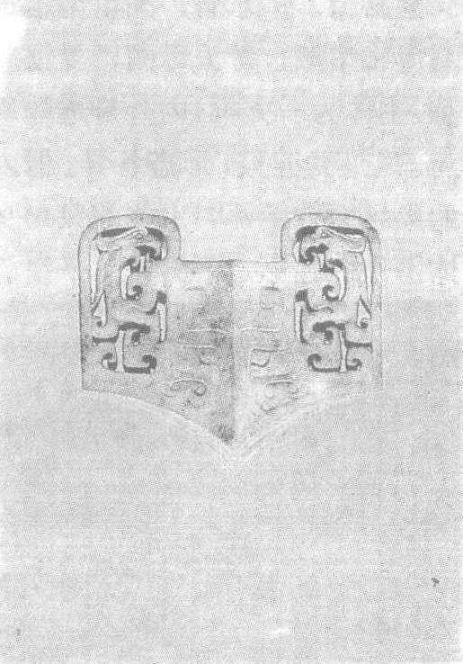 西汉早期。高6.1厘米,宽5.5厘米,厚2.5厘米。1983年广东省广州市南越王赵昧墓出土。广东省广州市南越王墓博物馆藏。此为玉具剑饰中的一种,位于剑柄与剑身相连处。青玉琢制,体有浸蚀,外表涂朱砂,两面纹饰相同。中央为隐起的兽面纹,其两侧各透雕一只立凤。凤尖喙,突目,眼角细长,双凤侧首对望。形体优美活泼的凤与形象庄严、肃穆的兽面相配,使得玉格的纹饰构图张弛结合,对比强烈,达到了完美的统一。玉格有一椭圆形穿孔,可将剑柄插入。