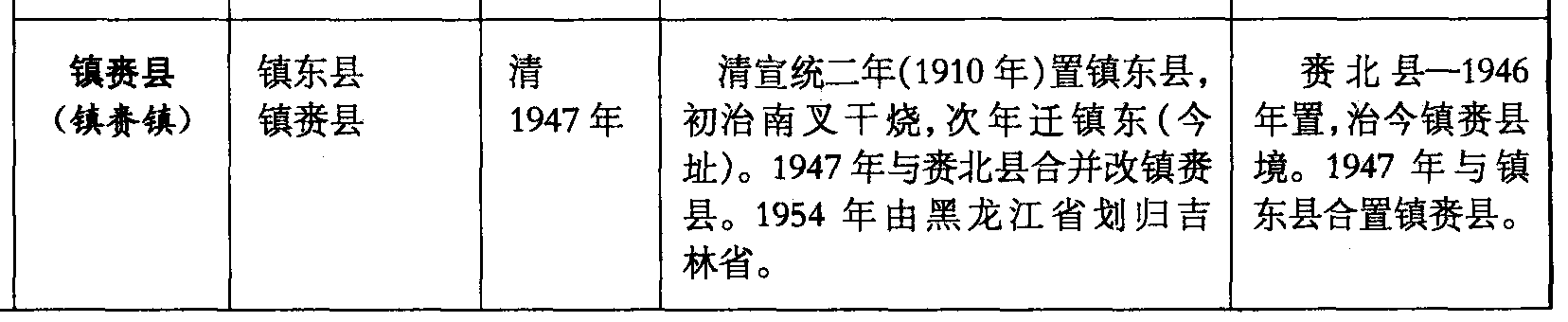 镇赉县(镇赉镇)镇东县镇赉县清1947年清宣统二年(1910年)置镇东县,初治南叉干烧,次年迁镇东(今址)。1947年与赉北县合并改镇赉县。1954年由黑龙江省划归吉林省。赉北县—1946年置,治今镇赉县境。1947年与镇东县合置镇赉县。