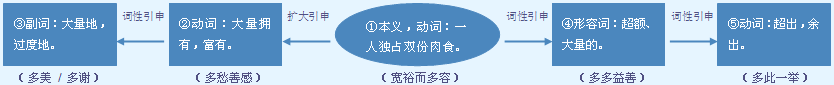 释义 | ![]() ❶形 数量大(跟“少”或“寡”相对)。 【例句】好友~年不见。 【同义】好些;好多;许多;诸多;众多 【辨析】“多” 强调数量上超过一般,是通用词;“好些”强调数量多,有口语色彩,有时可用于书面语。 【反义】少;寡 【例句】要继承和发扬艰苦奋斗的精神,~花钱,多办事。 ❷数 (用在数量短语后)表示有零头。 【例句】五丈~高。 【同义】见“来”。 ❸副 用在感叹句里,表示程度很高。 【例句】你看这些老战士,~有精神! 【同义】见“多么”。 ❶ 数量大: ~次|~数|人~势众|积少成~|~~益善。 少 shǎo ~量|~许|~则一两天就可以了|争取~花些钱,多办些事。 寡 guǎ 郁郁~欢|~言少语|终因~不敌众而败下阵来。 ❷ 比原有或应有的数大: ~了一个位子|~一两个人没关系|他喜欢菜里~加点辣椒。 少 shǎo 钱给~了|这段引文~了好几个字。 数量大(与“少”或“寡”相对)。有时可重叠。可受程度副词的修饰。 a.作谓语,可带补语。 人~力量大|他们家的人很~|每到节假日,到这个水库来划船的人~极了|每年秋天,这里展出的菊花的品种~得数不清。 b.作定语或带上修饰语作定语。 他~才~艺|很~人聚集在广场中央|好~事都等待着她去做|这么~书都是新近买的。 c.作状语。 她可以在乡下~住几天|小院里该~种点花|请~~帮助|请~~谅解|请您~~指教。 d.用在动词后作补语,常用“得”。 吃得~|用得~|说得~,做得少|他知道得太~了|酒喝~了。 ❶超出原有或应有的数目,比原来的数目有所增加(跟“少”相对) a.作带宾、带补谓语。 成都的秋天~雨|云南省下关市~风|他身体~病|~了两个人|~过两张票|账上~了15块钱|~了两个工作日|运动衣~了一件|这个班的女生比那个班~五个|人数~不了|万元户~起来了|~出来五块钱|~出三张票来|你找的钱~了。 b.构成词组作定语,要带“的”。 过道上堆放的是~出来的课桌|她拿走的是~出来的茶杯。 ❷过分的;不必要的。作带宾、带补谓语。 我这儿说话,他倒~了心了|我们交谈时,他从来没有~过嘴|那种场合,你~不得嘴|你怎么也~起心来了|他也~上心了|小孩子家怎么也~开嘴了? 用在量词前表示概数。常同量词连用作定语、补语。能用“许多”替换。 这道题有~种解法|那里我去过~次。 用在数词或数量词后边,表示不确定的零数。用在数词后时,数词必须是十位以上的整位数,如能说20多、70多、150多等,不能说25多、105多等;用在量词后时,量词前的数词不是整位数词,如能说“两天多、15天多”等,一般不说20天多、70天多等。常与数量词组搭配充当句子成分。 a.作定语。 30~个人|10~个信封|六斤~梨|10~亩果园|415000~千克苹果。 b.作宾语。 鱼买了十~斤|那捆书有100~斤|这块肉少称了一斤~。 c.作补语。 病后,他回老家休息了三个~月|他在这个小厂干过一年~|走了20~里。 ❶用在疑问句里,询问程度、数量。大多用于有积极意义的单音节形容词。如“大”“高”“长”“远”“粗”“厚”等。多用于口语。只作状语。 那口古钟有~大?|华山有~高?|成昆铁路有~长?|你要~粗的绳子?|这木板~厚? ❷有“十分”“非常”的意思,表示程度很高。含夸张语气和强烈的感情色彩。 a.作状语。 你看她~能干!|北国的雪景,~美!|~好的老人啊!退休了还在为大家做好事|他~想你呀!|战士们~不愿意离开这片土地啊! b.作补语。 有了铁路可方便~了|这样做简单~了|好得~|快得~。 ❸表示任何一种程度,常用在“无论(不管)……多……”“多……都(也)……”“多……多……”等格式中。作状语。 不管遇到~大的困难,我们都能克服|~艰难的生活,她都能对付|用天上的云霞做床被子,要~大有~大。 【辨】 (一)有些语法书认为“好得多”“方便多了”中的“多”是形容词作补语。但“好得多”中的“多”同“吃得多”中的“多”有很大的不同:“吃得多”还可以有“吃得多不多”“吃得非常多”和“吃得少”等说法,而“好得多”就不得说成“好得多不多”“好得非常多”“好得少”等。“好得多”跟“好得很”的意思差不多,“方便多了”跟“方便极了”意义也相近。“很”“极”是副词,因此,我们主张把“好得多”中的“多”归入副词。 (二)多和开外:见“开外”。 (三)多和多么:见“多么”。 【反】 少 寡 鲜 〈动〉❶少 【词语】 多边 多才多艺 多愁善感 多此一举 多多益善 多方 多寡 多会儿 多亏 多面角 多面手 多面体 多谋善断 多幕剧 多难兴邦 多时 多事 多数 多糖 多头 多嫌 多谢 多心 多余 多嘴 字源解说 多,甲骨文 ![]() ![]() ![]() ![]() ![]() 附 文言版《説文解字》:多,重也。从重夕。夕者,相繹也,故爲多。重夕爲多,重日爲曡。凡多之屬皆从多。 ![]() 附 白话版《说文解字》:多,重复。字形采用“重夕”会义。夕,表示相演绎,所以变成多。重叠“夕”字叫“多”;重叠“日”字叫“曡”。所有与多相关的字,都采用“多”作边旁。 ![]() 引申线索 ![]() 【字族索引】 夕 多 【同音字】 duō |