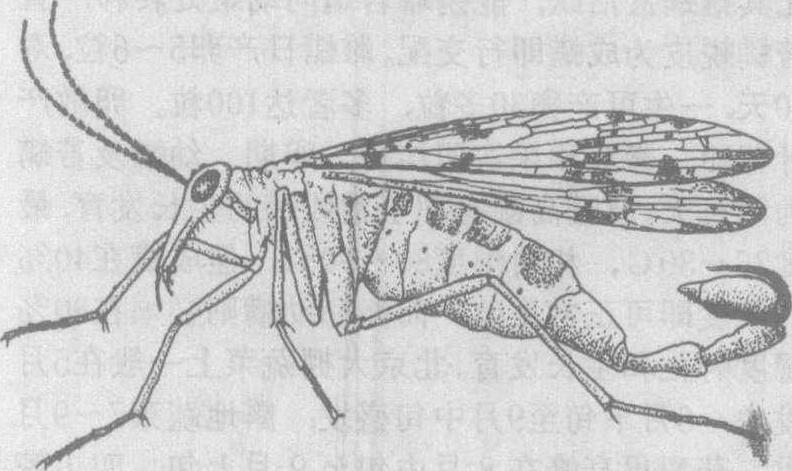 幼虫蠕虫型,与鳞翅目幼虫类似,常呈C形,表皮薄且软弱,白或淡色。蝎蛉属头部两侧各有小眼20~28个,额上端有一单眼,触角4节,下颚须4节,下唇须3节。胸足3对,均4节。腹部10节,第一至八节具圆锥形拟足,第十节具可伸缩的尾叉。 生活 年生1~2代,幼虫期约1个月左右,蛹期10~20日。成虫飞翔力弱,如遇危险时即潜入落叶下或草间。成虫、幼虫一般为肉食性或腐食性,捕食节肢动物或软体动物。蚊蝎蛉属成虫捕食蝇类等小昆虫。雪蝎蛉属成虫及幼虫取食苔藓类。另有取食花蜜、花蕊、果实等的种类。末龄幼虫在土室内休眠并化为裸蛹,羽化前移动到地面。 长翅目Mecoptera昆虫纲,有翅亚纲。通称蝎蛉,包括蝎蛉、蚊蝎蛉与雪蝎蛉等科。成虫体小至中型,细长。头垂直而延长;咀嚼式口器,下口式;触角长丝状;复眼大;单眼3个。前、后翅狭长、膜质,大小与翅脉相似,多横脉。蝎蛉科翅面常具斑纹。雪蝎蛉科翅退化且无单眼;雌虫腹末端细尖,雄虫第9节膨大成铗状,腹末数节向背方举起,形似蝎。蚊蝎蛉科雄生殖器不膨大,呈铗状;尾须短,1~2节。全变态。幼虫蠋形,色白而弯曲。胸足3对,腹足4~9对。捕食性,生活于树林杂草间,捕食各种小虫。中华蚊蝎蛉(Bittacus sinensisWalker)为江苏、浙江常见种。本目在中国已记载80多种。 蝎蛉 |