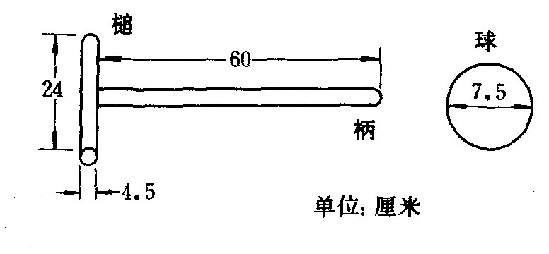 ❶门球棒(门球杆):由槌头和柄两部分构成,重量不限。槌头为圆柱形,长24厘米,直径为4.5厘米,槌头应为同一质料的整体,用木或树脂均可。槌头的两端为平面,不得有任何附加物。柄长不得少于60厘米。
