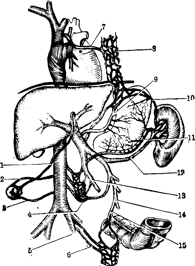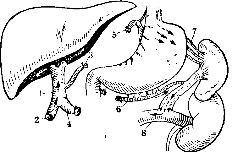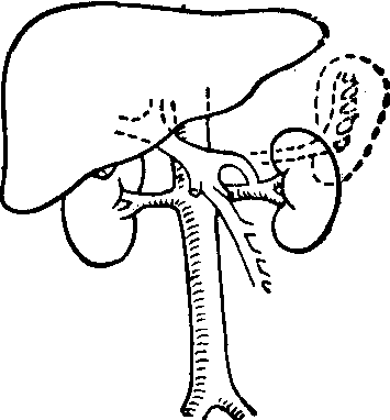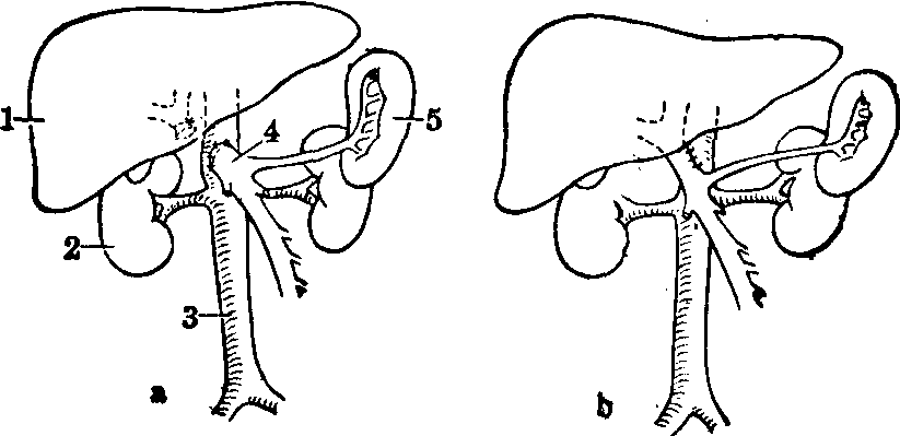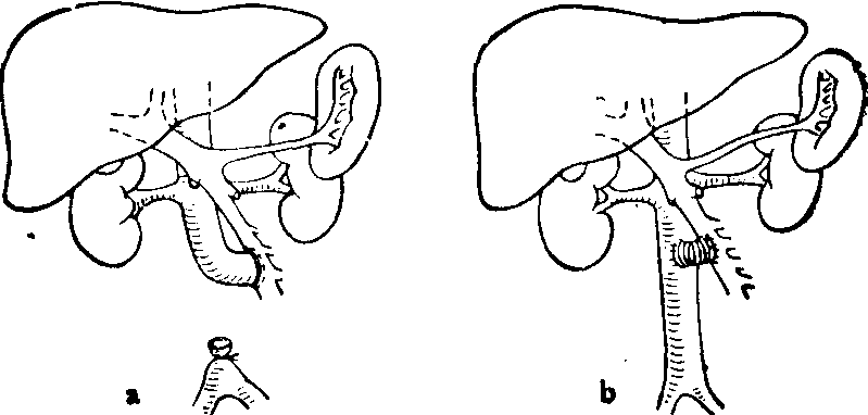 ❹选择性远侧脾肾静脉分流术:是将脾静脉在与肠系膜上静脉汇合处左侧切断,右侧断端结扎,左侧断端与左肾静脉进行端侧吻合(图5); 或将左肾静脉切断,其右侧断端与脾静脉行端侧吻合,吻合口右侧脾静脉行结扎。同时结扎胃冠状静脉,胃网膜右静脉和脾动脉,切断脾结肠韧带。本手术可选择性地把胃和食管的静脉血液经脾静脉转流入肾静脉,减少曲张静脉破裂出血的机会,同时保持门静脉系统血流对肝脏的灌注,从而避免一般分流手术带来的肝功能损害。手术死亡率,术后再出血率及肝性脑病发生率均较低。但由于手术未切除脾,脾功能亢进难于得到纠正。 (4)腹水的治疗:以内科治疗为主,克尿噻、安替舒通、速尿等药物均有较好利尿和减轻腹水作用。近年来,利用腹水机将腹水收集、过滤、浓缩后再输入,有一定疗效。如腹水形成较快,可考虑按置腹钮。亦可用带有单向阀门的导管直接将腹水输入静脉内(Le Veen管)。门腔静脉侧侧吻合术能降低肝内门静脉压力,减少胸导管淋巴流量,消除醛固酮的过多分泌,因而对顽固性腹水有治疗作用,对肝功能较好的病例可适当采用。近来,用胸导管颈内静脉吻合术治疗顽固性腹水,腹水减少率可达65.5%~89.7%。 ☚ 肝移植 肝性脑病 ☛ 门静脉高压症 门静脉高压症门静脉高压症系门静脉系统血流受阻、郁滞,使门静脉压力增高。临床有出血(呕血)、脾大、腹水三大症状。造成门静脉血流障碍的原因,有门静脉血栓形成、门静脉缩窄、门静脉畸形、门静脉受压及肝静脉返流梗阻、肝静脉阻塞综合征(Budd-Chiari综合征)等。一般将门静脉高压症分为肝内型及肝外型,肝内型又可分为窦前及窦后型,肝外型又分为肝前及肝后型,后者亦即肝静脉回流受阻所致。 ☚ 小儿肝移植 小儿外科性黄疸 ☛ 门静脉高压症 门静脉高压症门静脉系统血液动力学及门静脉高压 门静脉系统包括门静脉及其所属脾静脉;肠系膜上静脉(汇集小肠与右半结肠静脉血)及肠系膜下静脉(汇集左半结肠与直肠静脉血)。进入门静脉的血量20~30%来自脾脏,其余70~80%来自消化道。正常肝脏的血流量为每分钟1,000~1,500 ml,约占循环血量的20~30%,其中3/4由门静脉供应。1/4由肝动脉输入。肝动脉分支血液在进入肝窦时,有括约肌控制血流量,使肝动脉与门静脉血均匀而缓慢地进入肝窦。正常门静脉压为5~20 cm H2O。由于消化道的动、静脉有广泛交通支存在,故门静脉血液血氧饱和度较体静脉为高,肝脏的供氧60%靠门静脉,40%靠肝动脉。
