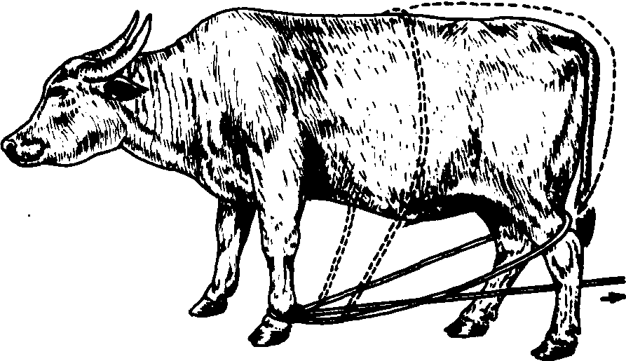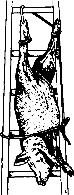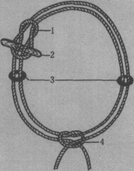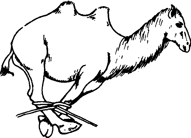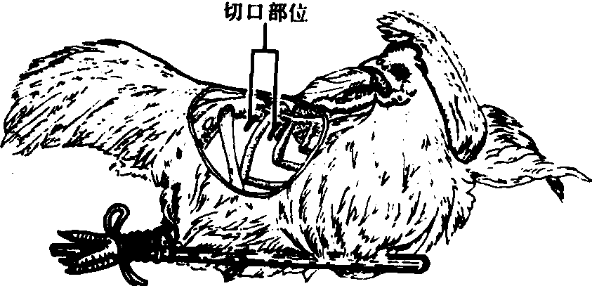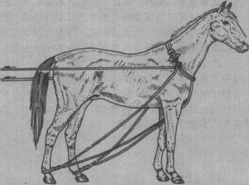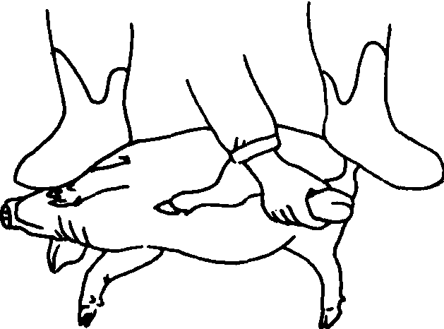 释义 | 阉割保定法restraints of castrations and spayings采用简单器械或徒手限制动物活动以便于施行阉割手术的方法。保定是进行畜禽阉割的重要步骤。中国民间的畜禽保定方法具有丰富的内容,悠久的历史, 出现的时间可以追溯到公元前11世纪阉割术发明之前。其方法不但安全可靠,而且结扣简易, 牢固平展, 捆缚打结迅速, 易结易解, 不会因动物的挣扎而松脱。从而可以保证阉割手术的顺利进行及人畜的安全。各种畜禽常用的阉割保定方主要有以下几种。 图 1 双套倒马法保定前的结扣 马骡保定法 双套法 需要3人。1人牵抓笼头,马体倒卧后固定头颈; 另2人抽拉保定绳, 放倒后捆缚马体。❶在保定绳的中部打结, 一端稍长、一端稍短, 并以双活结分别将两个绳环加以固定。然后向两边绳环上分别套一铁环。把两个绳环置骟畜左右侧颈部。穿棍交叉固定(图1)。 ❷将保定绳的游离端同时穿过两前肢和两后肢之间, 然后分别向外绕过同侧后肢系部, 并与同侧腹下绳绞扭一周, 以免系部绳滑脱。再把绳头穿过同侧颈部铁环。 ❸两侧保定人员各自向后牵拉同侧绳端(图2), 使骟畜以左或右侧躺卧姿势倒卧。倒卧后在牲畜头下垫以头垫并予固定。另2人再用力牵拉二绳头, 使两后肢的蹄尖接近两前肢的肘头部, 把右或左侧绳向外扭转一个绳圈, 套在两后肢的系部并予牵拉。打结固定在小木棍之上。, 图 2 双套倒马法的套绳 单套法 需要2人。一人控制头颈,一人放马。❶保定绳的一端先套一铁环, 在颈基部作一绳圈, 用拴马结(图3)固定,把铁环放在颈部右侧,绳头从右前方通过腹下, 如双套法缠绕左后肢系部, 并作交叉。 ❷将绳头拉向右前方, 穿过铁环。此时保定人员握住绳头, 由骟畜右后侧转向左侧臀部, 用力牵拉绳头, 使骟畜呈左侧倒卧, 把左后肢蹄尖拉向右前肢肘部, 向外绞扭一绳圈予以固定。 ❸用双活结固定右后肢系部, 使蹄尖靠近右前肢肘头。 图3 拴马结 公牛保定法 站立保定法 适用于性情温驯的牛。由1人用牛鼻钳夹住或用手指握住鼻中隔及牛角,用绳子把牛尾拴在颈部。另外2人分别用背部靠紧牛的躯干两侧,两手分别握住同侧的耳和肷部下方的松软皮肤。 倒卧保定法 ❶用5米长的绳子1条,绳的一端拴一铁环,无铁环时可作一个小绳圈,先把有铁环或绳圈的一端拴到左侧前腿的寸腕上(即系部),再把绳由左向右通过胸下绕背部一周。 ❷将绳头穿过铁环或绳圈后,再把绳头向后从两后腿间拉出;然后把绕在背部的绳圈移到后腿的大腿部。 ❸当保定者向后用力牵拉绳头时,公牛左前腿和两后腿就因向腿下一齐靠拢而倒向主侧。为了避免牛只在放倒时损伤头部和角,应有1人控制头部,并于头下铺上头垫。 ❹牛只倒地后,用一条比较短的绳,在小腿部分别用活结捆住两前肢和两后肢,然后再把四条腿拉拢捆缚在一起(图4)。 图4 牛倒卧保定法 公羊保定法 抱起法 适用于羔羊。助手抱起羔羊,背向保定人的腹部,腹向术者,头向上,臀向下,用两手分别握住同侧的前后肢。 倒提法 适用于小羊。助手以两手分别握住羊只的两后肢球节上方提起,两腿夹住羊只的颈部。 横卧法 适用于大羊。保定人员站在羊体左侧,两手绕羊背及右侧,分别握住二前肢和二后肢球节上方,并提举前后肢,使羊成左侧横卧姿势。用保定绳把四肢固定在一起。 公驼保定法 使驼伏卧。❶将6米长保定绳对折,置于骆驼左侧,使绳的对折端超过驼肩。 ❷1人站在其头部左前方,按压头部,使左侧横卧,2人在骆驼左侧用手按压驼峰。先向右侧推动,随即向左侧按压,使驼体左侧横卧。 ❸1人用力按压头部;另外2人,1人转向前肢前方,1人转向后肢后方,把两个绳头穿过肩头绳圈后,分别用力牵拉一个绳头,使四肢靠拢,打活结固定。再用2米长的保定绳,在四肢系部固定(图5)。 图5 公驼保定法 母猪小挑花阉割术保定法 术者站立或坐于小凳上,由助手握住小猪左后腿成倒立姿势交与术者。术者以左手握猪后腿,以右手握住左侧膝前皱襞,随即使猪右侧横卧于地。此时,猪头部在术者右侧,背向术者。术者随即用右脚掌压住猪颈左侧,将猪左后腿向后拉直。术者以左脚踩关节下缘处,使小猪呈头胸部侧卧,腹部半仰卧姿势。猪体的下颚、左侧膝前皱襞、膝盖构成一条直线。 母猪大挑花阉割术保定法横卧保定法 用一结实木棒压住母猪颈部,并用绳拴紧两后腿。也可由助手将母猪呈右侧(或左侧)横卧后,术者站在母猪的背外侧,并用右脚踩住母猪的颈侧面,两后肢由畜主保定并拉直。 倒吊保定法 适用于中小猪。取带铁环的绳索一根、梯子一把。先把绳索搭在梯子横柱上,使有铁环的一端在梯前,另一端在梯后。将母猪倒挂,使腹部朝前,背靠梯子。绳端穿过铁环,先套在猪左后腿的小腿上,将梯后绳端作一绞扭的圈套,套在右后肢的小腿上。然后用绳头拉向梯子下部捆缚住猪的胸部,打活结固定(图6)。 图6 猪倒吊保定法 公猪保定法 取左侧横卧保定。猪身背向术者,术者以左脚踩住颈部,右脚踩住尾根(图7)。此法适用于小公猪。 图7 公猪保定法 大公猪的保定方法和大母猪相同, 但应取左侧横卧, 以便利操作。 犬保定法 右侧横卧保定法 助手用夹狗钳夹住犬的颈部,术者使犬成右侧横卧。然后使犬腹部向上, 用左脚踩住犬的两后肢小腿前面, 使犬爪掌向地面。 仰卧保定法 助手用夹狗钳夹住颈部, 使成仰卧姿势。术者坐于放置在狗尾后的