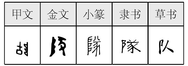 队duì (甲1) (甲2) (金) (篆) 繁体为“隊”,会意字,甲骨文左边是山崖,右边是头朝下的人(“子”的倒形),表示人从山上摔下,是“坠”(墜,zhuì)本字。甲骨文另一款上为“八”,下为“豕”,倒置过来,表示猪从高处掉下来。后变为“隊”,简化为“队”。古无“地”字。从山崖上摔下来,掉在地上,故“队”即“地”。作声符生成的字有: zhuì 坠(坠落)