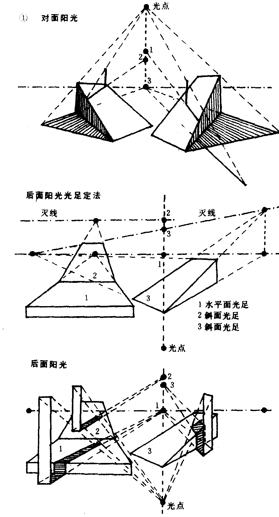 ❸对面阳光:光线从画者前方射来,因是平行光线,向前愈远愈集中于一点(即太阳光点)。光点向下引垂直线与视平线相交点为光足。画斜面上的光影,由光点向下引垂直线与斜面灭线相交便是光足。