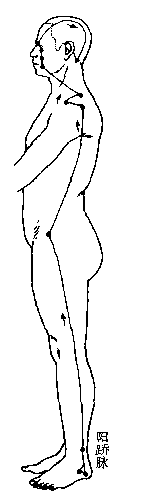 释义 | 阳𫐆脉奇经八脉之一。出《灵枢·寒热病》。其循行路线,据《难经·二十八难》载:“阳𫐆脉者,起于跟中,循外踝上行,入风池。”本脉自足跟外侧的申脉穴起始,经外踝上行腓骨后缘,沿股部外侧,经髋、胁,至肩膊外侧,沿颈上至口吻,到目内眦,与太阳、阴𫐆脉会合,再上行经额,与足少阳经合于风池。本脉发生病变,主要表现为失眠,目痛从内眦始等(图65)。 图65 |