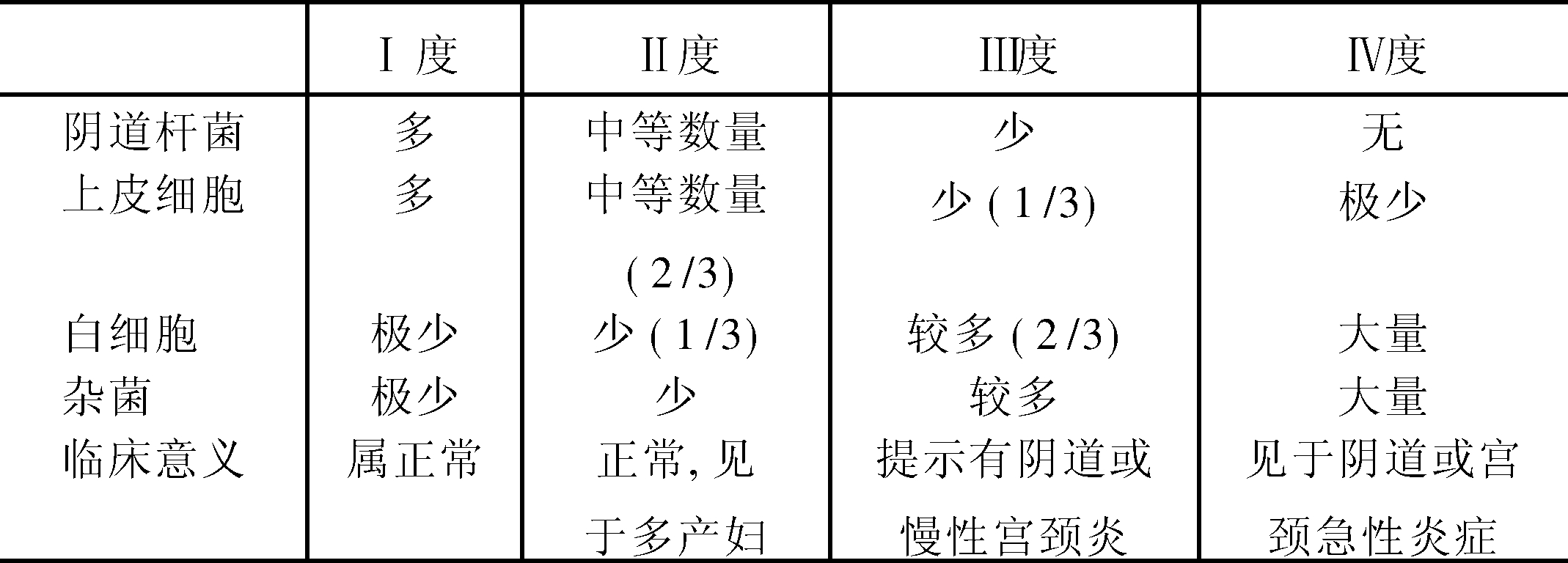 评价阴道清洁状态的一种方法。根据下表中几项检查结果,将阴道清洁度分为四度: