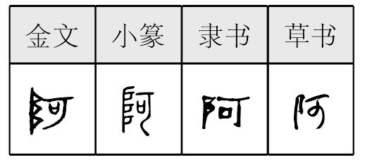 ❹ 持正不阿|刚正不阿|刚直不阿|公正不阿|正直不阿 阿ā,ē形声字。《说文》:“大陵曰‘阿’,从阜,可声。”本义为山陵。王勃《滕王阁序》:“俨骖于上路,访风景于崇阿。”“崇阿”便是高山。因为山脊大都逶迤起伏,山麓大都蜿蜒曲折,故引申为“曲”、曲隅。《楚辞·山鬼》:“若有人兮山之阿。”注:“阿,曲隅也。”“阿谀奉承”便有违心地曲意奉承的意思。以上均读ē。ē,发音时口张大些便为ā。现代汉语中“阿”大多读为ā,可为词的前缀,如“阿哥阿妹情意长,好像那流水日夜响”。如果说“可”是一级声符,那么“阿”便是二级声符。作为二级声符生成的形声字有: ā 啊(象声词,表语气ā、á、ǎ、à四声及轻音均可) 锕(金属元素) ē 屙 婀(婀娜,“阿”兼表意,有曲线之美) 相关链接 从语音角度看,a为元音,是《汉语拼音方案》中的一个单韵母。它与o、e都是开口呼。发音时,a—o—e口形由大到小,由圆而扁,舌位随之抬高,可一气呵成。故a—e为近似音。 阿 金文; 篆ā[阝(在左,阜,意符)+可(聲符)→阿(《説文》:“阿,大陵也。一曰:阿、曲阜也。從阜可聲。”阿,加在稱呼上的詞頭:阿大、阿爺、阿爹、阿羅漢、阿婆、阿弟、阿姊等。)] 《詩經·衛風·考盤》:“考盤在阿,碩人之薖。”(快樂啊在山窩,好人啊真愜意。) 阿(7画) ❶ā ❷ē