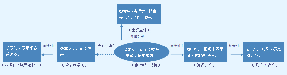 字源解说 本 字“乎” “乎”是“呼”的本字。 乎,甲骨文字形 在号角 上加三点 指事符号,三点指事符号 代表吹奏的气流通过号角发出的声音。造字本义:号角吹得紧急、响亮,代表部落的紧急“呼叫”。金文 承续甲骨文字形。有的金文 加一撇。篆文 将金文字形 减一点。隶书 将金文字形 中上部的点与下部的竖连写,变形较大。当“乎”的“呼叫”本义消失后,再加“口”另造“呼”代替。号角吹不出任何声音叫“亏”(表示完全缺乏中气);号角吹得“嘘嘘”无力叫“兮”;号角高亢并紧急叫“乎”(“呼”,部落紧急招集的号角);号角吹得音调悠长、稳定、没有起伏变化叫“平”(号音平直,表示平安无事,没有警情)。 合并字“虖” 乎,既是声旁也是形旁,是“呼”的本字,表示呼叫。虖,金文 = (虎头)+ (乎,呼叫),表示山中虎啸。造字本义:虎啸。篆文 将金文的虎头 写成 。隶化后印刷体楷书 将篆文的 写成 ,将篆文的 写成 。 附 乎 文言版《説文解字》:乎,語之餘也。从兮,象聲上越揚之形也。 附 乎 白话版《说文解字》:乎,语尾的叹词。字形采用“兮”作边旁,像声音向上越扬的形状。 附 虖 文言版《説文解字》:虖,哮虖也。从虍, 聲。 附 虖 白话版《说文解字》:虖,虎叫声。字形采用“虍”作边旁,采用“ ”作声旁。 引申线索