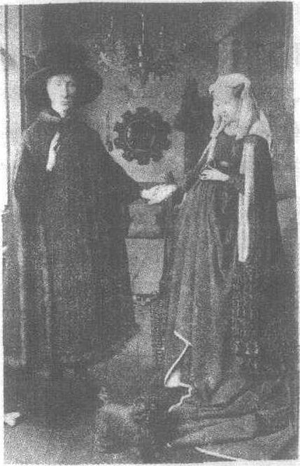 尼德兰画家杨·凡·爱克作于1434年。木板油画。藏伦敦国家美术馆。是描绘尼德兰富商家一对新婚夫妇的肖像画。阿尔诺芬尼举着右手,而新娘把右手合在他的左手上——画家向我们展现了他们俩人正在作最庄严誓约的一瞬间。挂在墙上的凸镜,反射出房间里看不见的一面,它延伸了室内空间。柔和的阳光从左边窗口照射进来,在房间里投下不同的阴影,同时使吊着的铜灯、主人公穿着的毛皮披风、白色面纱……显示出不同的光度。画家为了进一步增强画中事件的真实性,还将自己的形象映入凸镜中,并在镜子上方写着“杨·凡·爱克在此,1434年”。不仅如此,为了表示婚礼的庄严意义,他还使用了种种象征手法。如:烛台上的蜡烛白天还点着,象征着耶稣在观望他们的婚礼; 鞋子脱于一旁,表示他们站在“圣土”上;那只小狗则象征忠贞;房内许多其他装饰,也都含有宗教性的意义。不过杨·凡·爱克的功绩正在于,在继承中世纪象征手法的同时,他能将这些象征隐寓在现实的日常生活之中,从而创立了一种非常写实而动人的绘画形式。