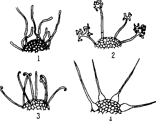附属丝类型 1.菌丝型 2. 二叉分枝型 3. 钩丝型 4. 球针型 |
