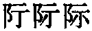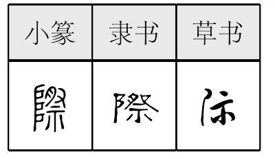 jì際,形声,从阜,祭声,本义为两墙相接处的缝,引申为交界或靠边的地方、相互之间、中间等。近代俗字、《手头字》、《简化字表》简作“际”,省略音符上边的部件。 |