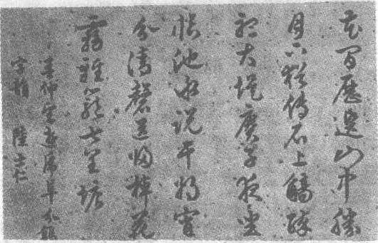 明。纸本。册页。纵33.1厘米,横62厘米。江苏省苏州博物馆藏。陆士仁,生卒年不详,字文近,号澄湖,长洲(今江苏苏州)人。父陆师道是嘉靖进士,曾为文徵明弟子,陆士仁受家学影响,亦善书画,山水笔法雅洁。册页中还有张凤翼、王穉登等人的法书。此七言律诗是陆士仁游虎丘时所作诗:“春半吴洲百草芳,白堤新柳有鸣鸧,花间历选山中胜,月下犹传石上觞。醉听大堤赓子夜,坐临池水说干将。宵分清磬送归棹,花雾轻笼七里塘。”款署:“春仲望游虎阜,分鸧字韵,陆士仁”。草书字距疏,行距大,清新隽永,笔锋外露,字体严谨闲雅,充满灵动之势,用笔沉着劲爽潇洒利索,寓婀娜流利于刚健端庄之中。篇章布局行气一贯,重心平稳,无起伏摆动,给人以安详、静穆之感。